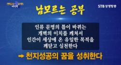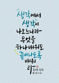 부단히 공부하라생각에서 생각이 나오느니라. 무엇을 하나 배워도 끝이 나도록 배워라.세상에 생이지지(生而知之)란 없느니라.천지에서 바람과 비를 짓는 데도 무한한 공력을 들이느니라.너희들 공부는 성경신(誠敬信) 석 자 공부니라.[증산도 道典 8:7]