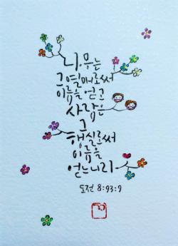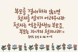 하루는 말씀하시기를 “부모를 경애하지 않으면천지를 섬기기 어려우니라.천지는 억조창생의 부모요,부모는 자녀의 천지니라.또 말씀하시기를“조상은 아니 위하고나를 위한다 함은 부당하나니 조상의 제사를 극진히 받들라.사람이 조상에게서 몸을 받은 은혜로조상 제사를 지내는 것은천지의 덕에 합하느니라.” 하시니라.(증산도 道典 2:26)캘리 by 이다경...