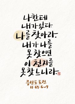 나를 찾아라태모님께서 말씀하시기를“나한테 내가 있다, 나를 찾아라.내가 나를 못 찾으면 이 천지를 못 찾느니라.” 하시니라.(증산도 道典 11:69)캘리 by 이다경 도생