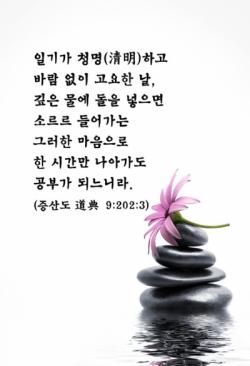 내 한 몸 잘 닦는 일일신수습중천금一身收拾重千金이니경각안위재처심頃刻安危在處心이라내 한 몸 잘 가짐이 천금보다 중하니순간의 평안함과 위태로움이마음가짐에 달려 있느니라.잠심지하도덕존언潛心之下에 道德存焉이요반장지간병법재언反掌之間에 兵法在焉이라무심한 사이에 도덕이 존재하고손바닥 뒤집는 사이에도 병법이 있느니라.[증산도 道典 8:5]