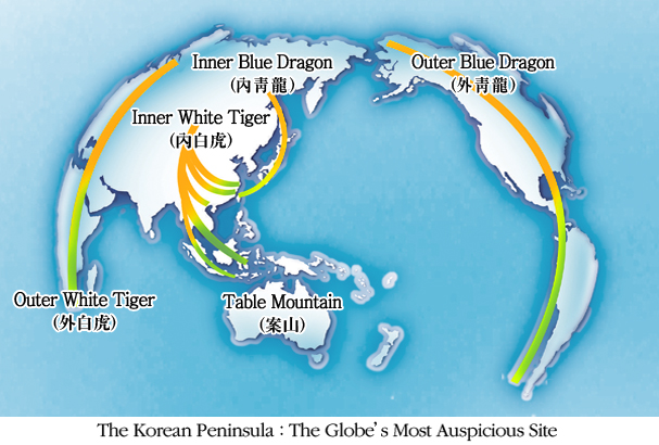 Korea had always been destined as the place of incarnation for Sahng-jeh-nim, the Ruling God of the universe. Jeung San Do’s Supreme Dao Master Ahn Oon-sahn revealed that Korea is the globe’s most auspicious site, where the earth’s life energy most strongly concentrates. According to the principle of earth (which is related to feng shui), the Korean Peninsula is guarded by five oceans and six continents. The Japanese archipelago comprises the “Inner Blue Dragon” (內靑龍); the Americas comprise the “Outer Blue Dragon” (外靑龍); the landmass from China to Singapore forms the “Inner White Tiger” (內白虎); Africa and parts of Eurasia form the “Outer White Tiger” (外白虎); Australia is the “Table Mountain” (案山). These major landmasses consolidate the terrestrial energies in the Korean Peninsula, making Korea the cardinal site of the globe.
